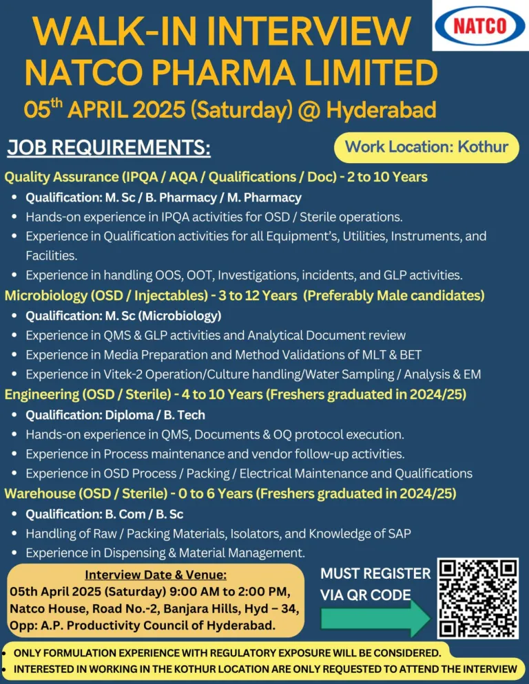 - Qualification: M.Sc / B.Pharmacy / M.Pharmacy
