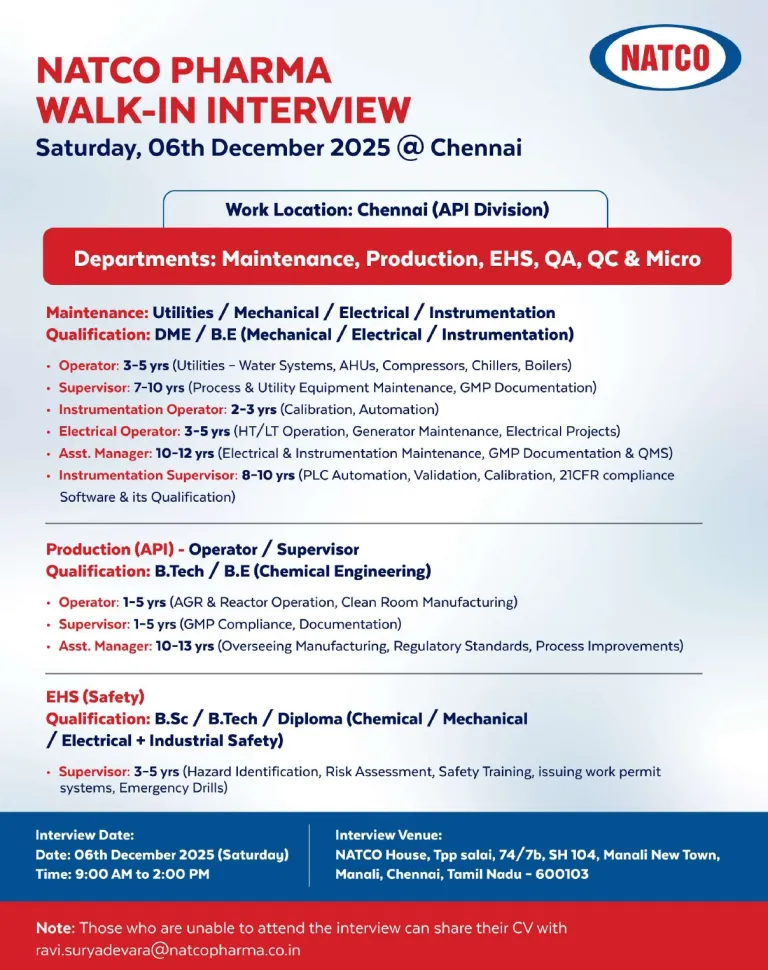 NATCO Pharma is hiring!. Join us for a walk-in interview on 06th December 2025 in Chennai across key functions: Maintenance, Production, EHS, QA, QC & Microbiology. Be part of a team that is committed to quality, innovation, and excellence in API manufacturing.