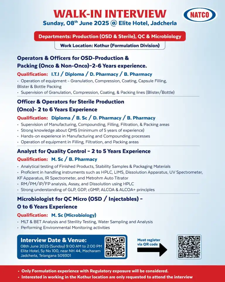 - Only candidates willing to work at the Kothur location (Formulation Division) are requested to attend.