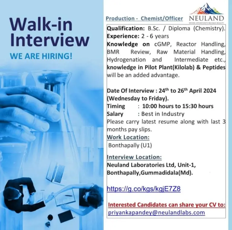 - Interview Location: Neuland Laboratories Ltd, Unit-1, Bonthapally, Gummadidala (Md).