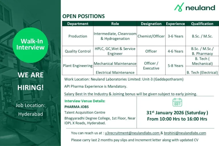 - Qualification: B.Sc / M.Sc / B.Pharm / B.Tech
