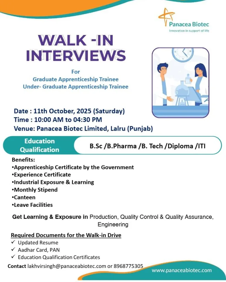 Interested Candidates may also send their CVs to lakhvirsingh@panaceabiotec.com