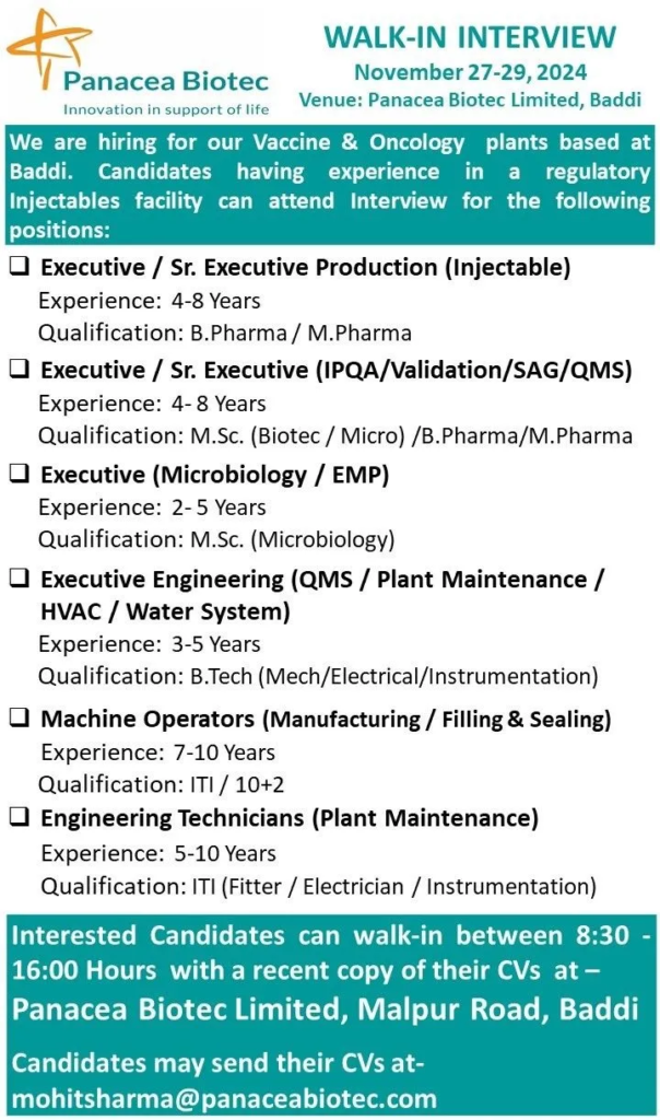 - Candidates may send their CVs at- mohitsharma@panaceabiotec.com