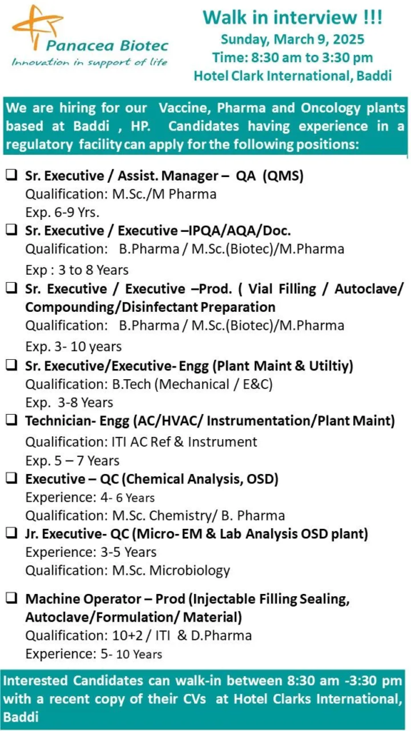 Interested Candidates can walk-in between 8:30 am 3:30 pm with a recent copy of their CVs at Hotel Clarks International, Baddi