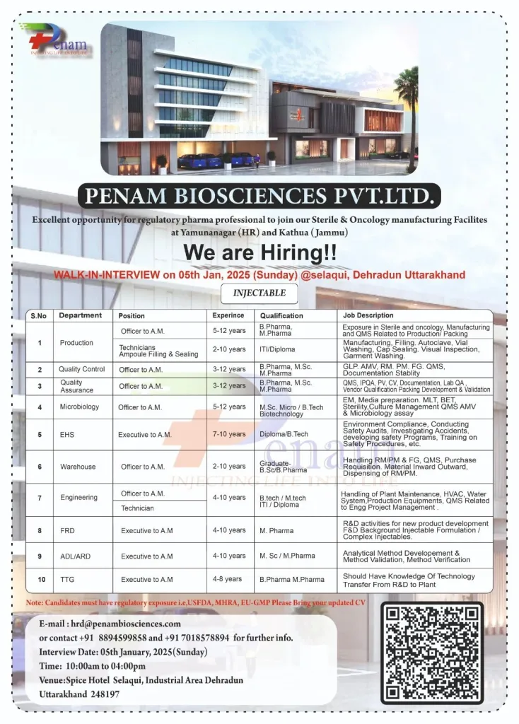 Excellent opportunity for regulatory pharma professional to join our Sterile & Oncology manufacturing Facilites at Yamunanagar (HR) and Kathua (Jammu). Join Us for a walk-in interview at Penam Biosciences. Penam Biosciencesis hiring! We’re holding a walk-in interview for talented professionals ready to make a difference in pharmaceutical innovation. If you’re passionate, skilled, and looking to grow in a dynamic environment, we’d love to meet you!