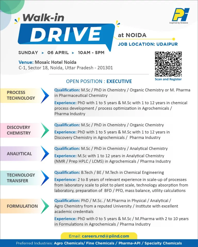 - Experience: PhD with 1 to 5 years & M.Sc with 1 to 12 years in chemical process development / process optimization in Agrochemicals/Pharma Industry