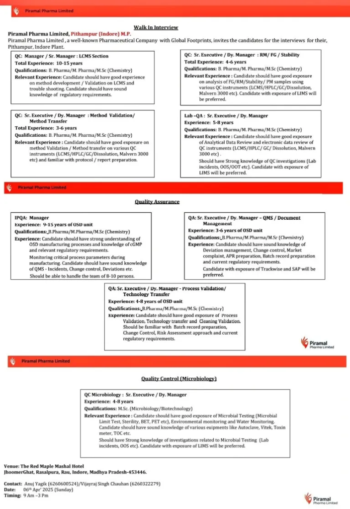 - Qualifications: B.Pharma/M.Pharma/M.Sc (Chemistry)