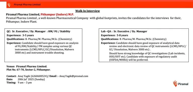 - Venue: Piramal Pharma Limited. Plot No. 67-70, Sector-2, Pithampur.