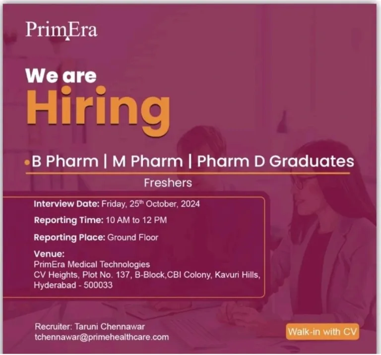 • Venue: PrimEra Medical Technologies, CV Heights, Plot No. 137, B-Block, Opp. to HDFC Bank, CBI Colony, Kavuri Hills, Hyderabad – 500033