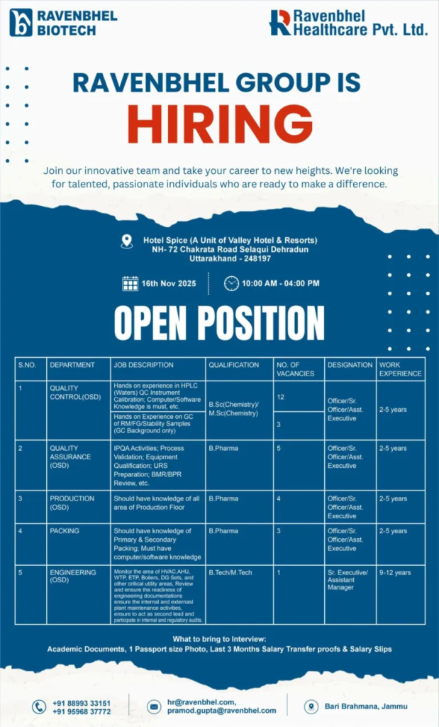 •  Qualifications: M.Pharma / B.Pharma / M.Sc / B.Sc