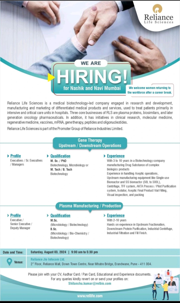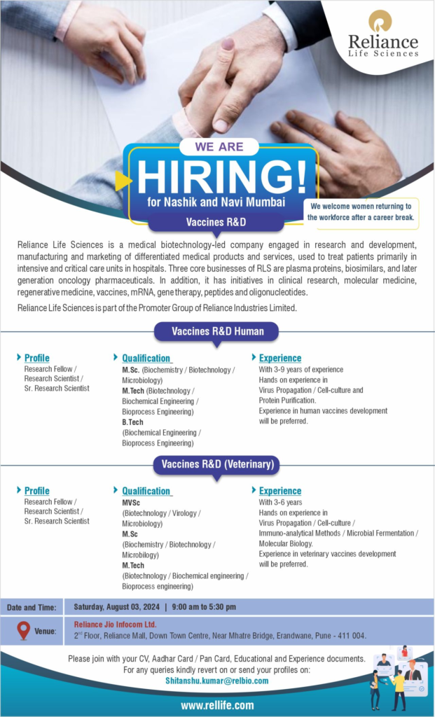 Reliance Life Sciences is a research-driven organization developing business opportunities in bio-therapeutics (plasma proteins, biosimilars and novel proteins), pharmaceuticals (later-generation, oncology generics), clinical research services, regenerative medicine (stem cells therapies) and molecular medicine. Reliance Life Sciences is part of the Promoter Group of Reliance Industries Limited.