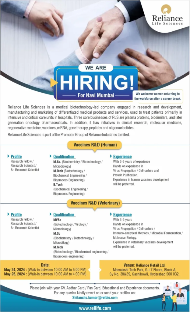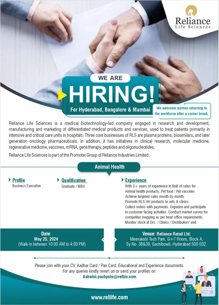 At Reliance Life Sciences, we cultivate a culture of innovation, collaboration and growth. Don’t miss the chance to make a meaningful difference! Bring your resume and seize the opportunity to embark on a fulfilling career journey with Reliance Life Sciences.