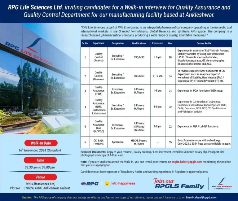 • Venue: RPG Lifesciences Ltd, Plot No – 3102/A, GIDC, Ankleshwar, Gujarat.