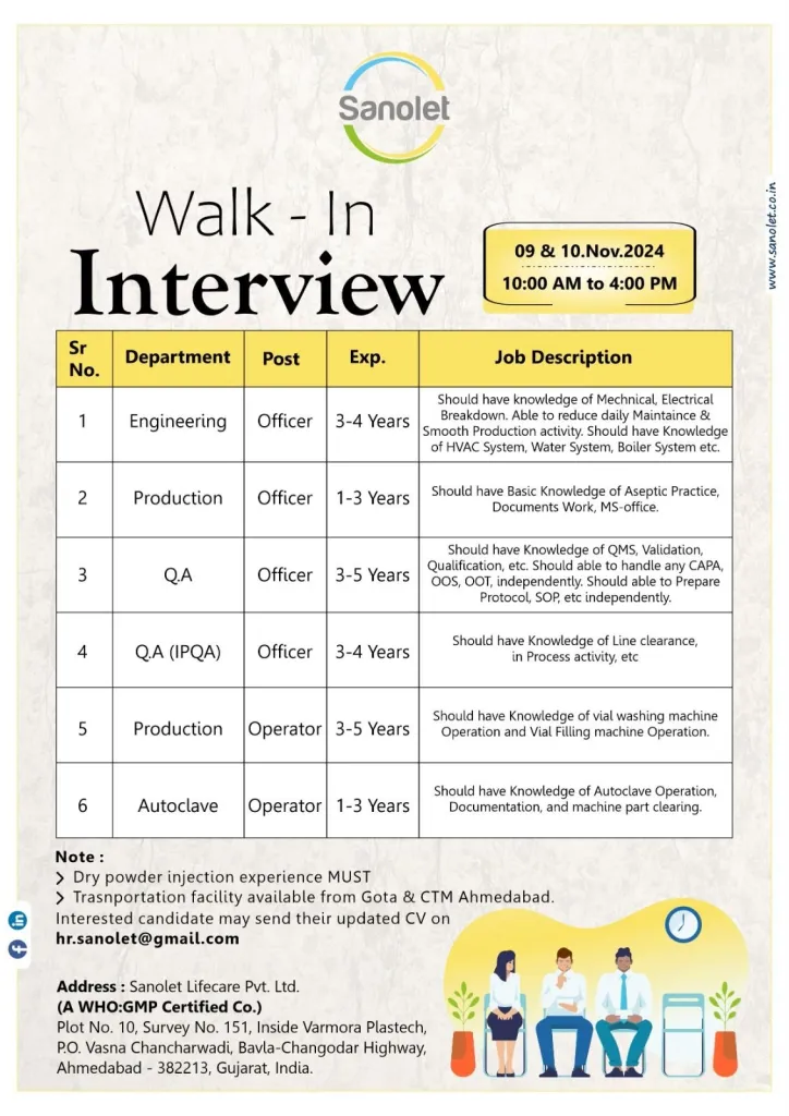 Sanolet Lifecare Pvt. Ltd is having state of art manufacturing plant for beta lactum dry powder injections. We are looking young and dynamic professional for following departments for Changodar- Ahmedabad Plant location.