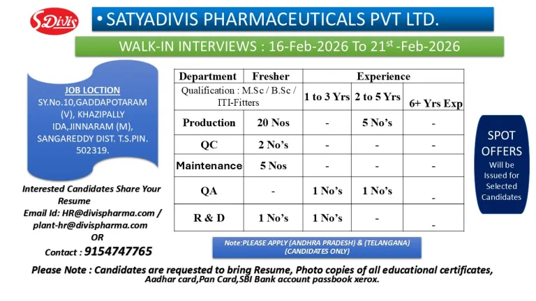 - Venue: Satyadivis Pharmaceuticals Pvt. Ltd. Sy.No.10, Gaddapotaram (V), Khazipally IDA, Jinnaram (M), Sangareddy Dist. T.S. PIN. 502319.