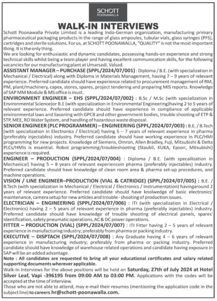 Walk-In Interviews for the above positions will be held on Saturday, 27th of July 2024 at Hotel Silver Leaf, Vapi -396195 from 09:00 AM to 03:00 PM. Applications with the codes will be accepted at the time of interview.