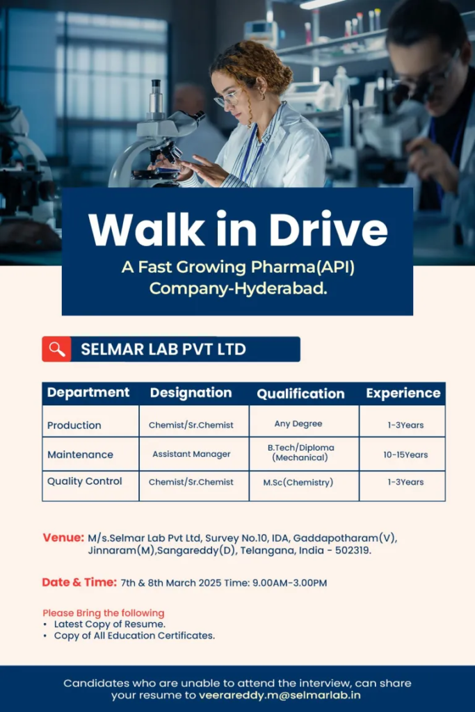 •  Venue: Selmar Lab Pvt Ltd, Survey No: 10, IDA Gaddapotharam (Vil), Jinnaram (Mndl), Sangareddy (Dist.), Telangana, India-502319.