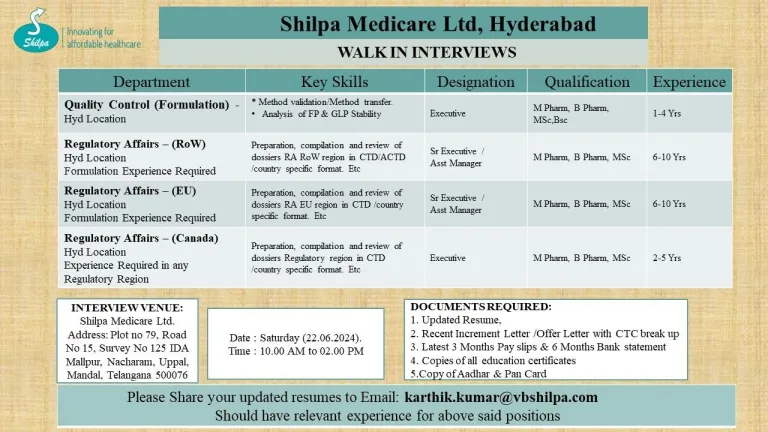 - Candidates Who are Unable to attend the interview can Mail your updated resumes to karthik.kumar@vbshilpa.com