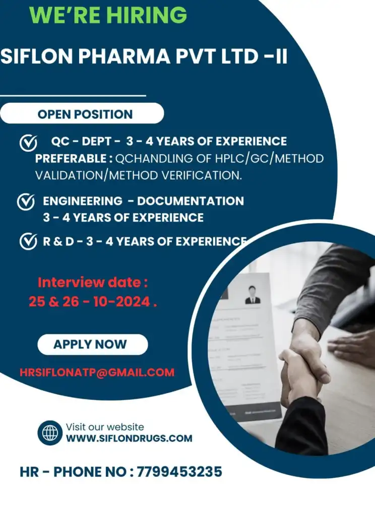 - Work Location: Siflon Pharma Pvt. Ltd, Unit-II, Atchuthapuram.
