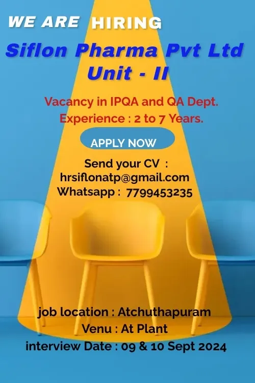 • Work Location & Job Location: Siflon Pharma Pvt. Ltd, Unit-II Atchuthapuram.