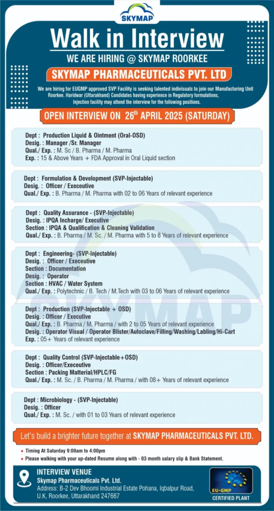 SKYMAP PHARMACEUTICALS PVT. LTD, We are hiring for EUGMP approved SVP Facility is seeking talented indivisuals to join our Manufacturing Unil Rourkes, Haridwar (Uttarakhand) Candidates having experience in Regulatory formulations, pection facility may attend the interview for the following positions