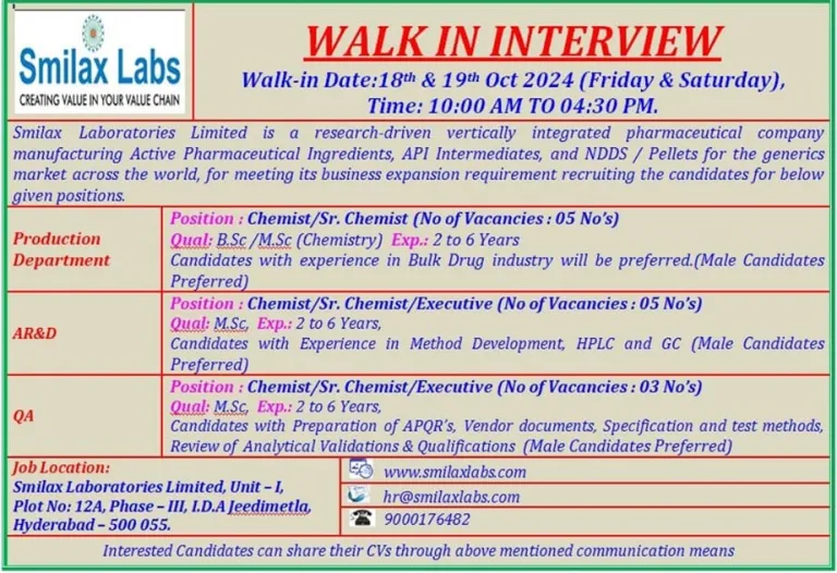 - Job Location & Venue: Smilax Laboratories Limited, Unit-I, Phase-III, IDA, Jeedimetla, Hyderabad