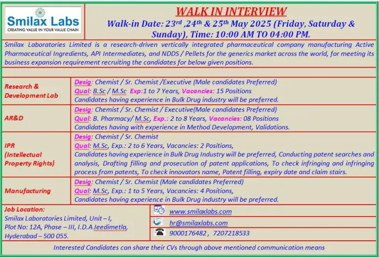 - Job Location & Venue: Smilax Laboratories Limited, Unit-I, Phase-III, IDA, Jeedimetla, Hyderabad