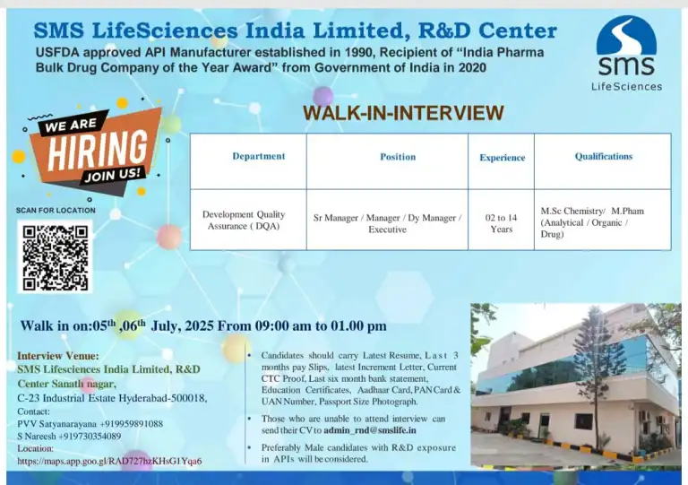 Venue: SMS Lifesciences India Limited,R&D Center Sanath Nagar C-23 industrial Estate Hyderabad