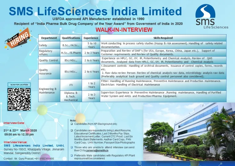 - Venue: SMS Lifesciences India Limited, Unit-l, Survey No-180/2 Khazipally Village. Jinnaram Mandal, Sangareddy District