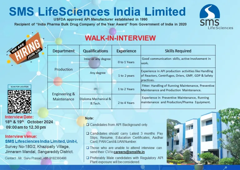- Venue: SMS Lifesciences India Limited, Unit-I, Kazipally, Hyderabad