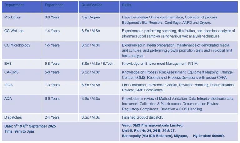 - Departments: Production / QC / QA / EHS / QC-Micro / IPQA / AQA / Dispatches