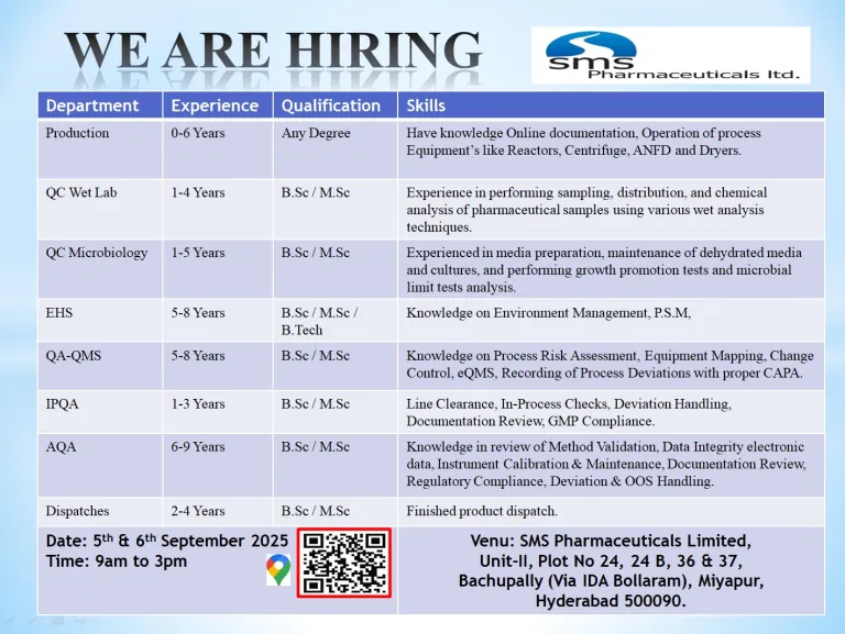 - Venue: SMS Pharmaceuticals Ltd, Unit-II, Plot No.: 24 & 24B, 36 & 37, Bachupally, Miyapur, Hyderabad.