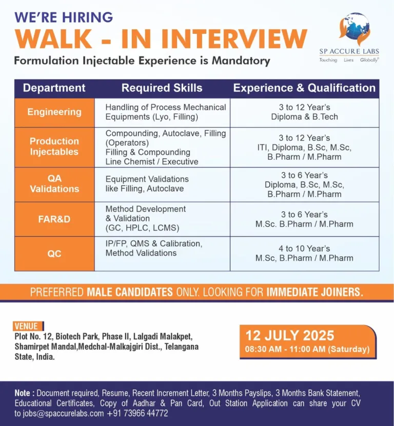 •  Qualifications: ITI, Diploma, B.Sc, M.Sc, B.Pharm, M.Pharm, B.Tech