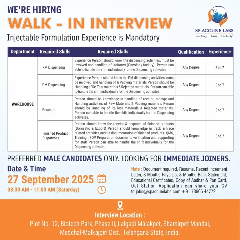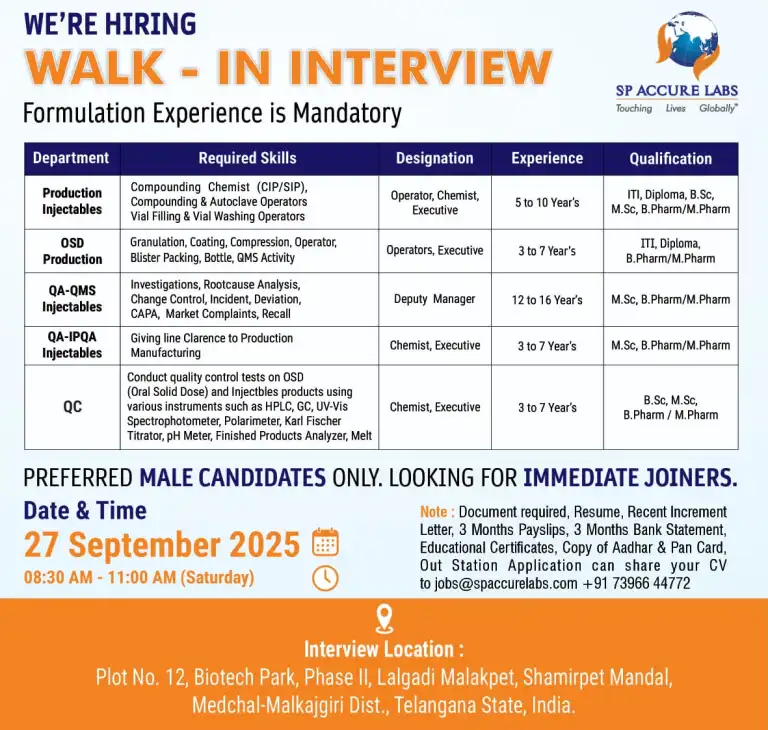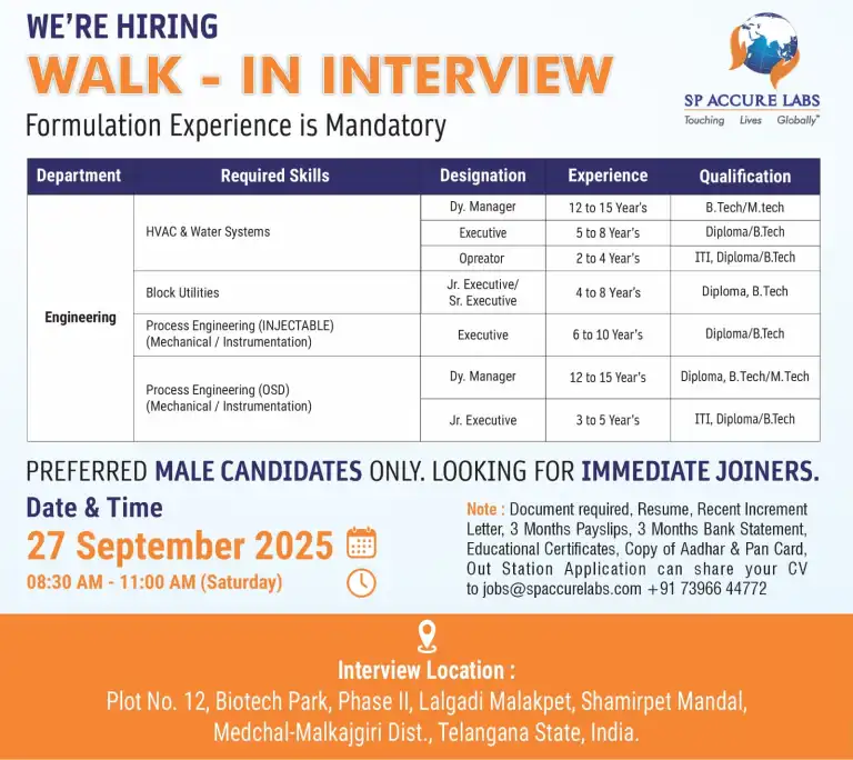 - Qualifications: ITI, Diploma, B.Sc, M.Sc, B.Pharm, M.Pharm, B.Tech, M.Tech, Any Degree