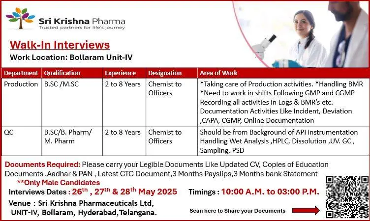 • Venue: Sri Krishna Pharma, Unit-IV, IDA Bollaram, Hyderabad, Telangana.