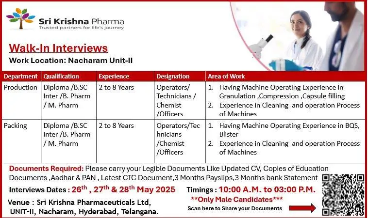 • Venue: Sri Krishna Pharma, Unit-II, IDA Nacharam, Hyderabad, Telangana.