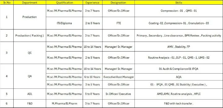 - Education : M.Pharm / B.Pharm / M.Sc / ITI / Diploma