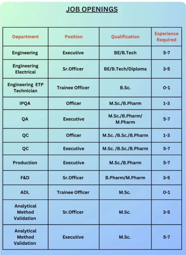 - Qualifications: B.Sc., M.Sc., B.Pharm, M.Pharm, BE/B.Tech, Diploma