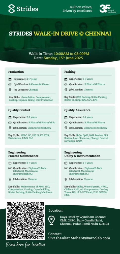 - Qualification: M.Sc / B.Pharm/M.Pharm / B.Tech / Diploma