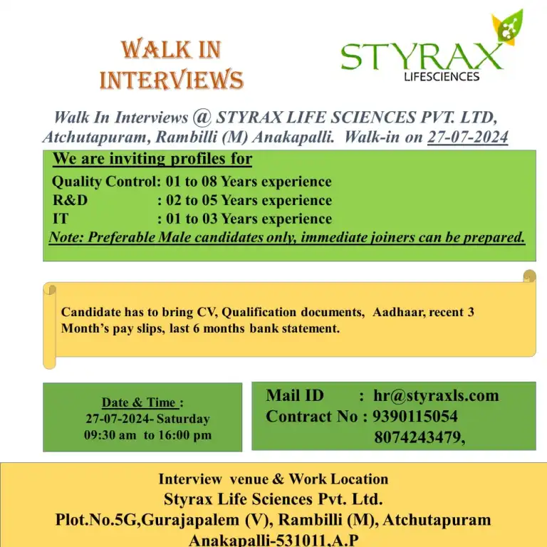 - Interview venue & Work Location: Styrax Life Sciences Pvt. Ltd. Plot.No. 5G, Gurajapalem (V), Rambilli (M), Atchutapuram, Anakapalli-531011.A.P