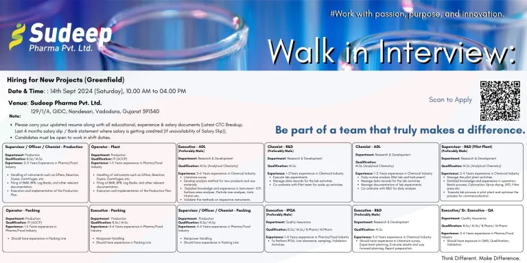 - Interview Location: Sudeep Pharma Pvt. Ltd (Greenfield Project), Plot no. 179, GIDC, Nandesari, Vadodara, Gujarat 391340