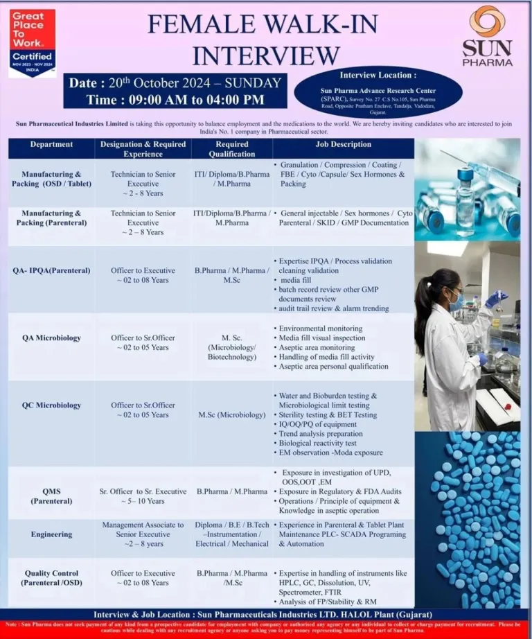 Sun Pharma is the fourth largest specialty generic pharmaceutical company in the world. We provide high-quality, affordable medicines trusted by healthcare professionals and patients in over 150 countries. It is also India’s largest, most trusted and most valuable pharmaceutical company by market capitalization. To keep pace with our growth plan we require young and energetic professionals for our Halol Location.