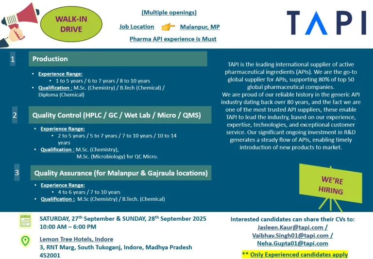 - Desired Exposure: Specific experience in areas like granulation, compression, tablet coating, OSD bottle packing, engineering QMS, process maintenance, utility and water systems, and raw material/packing material dispensing is sought.