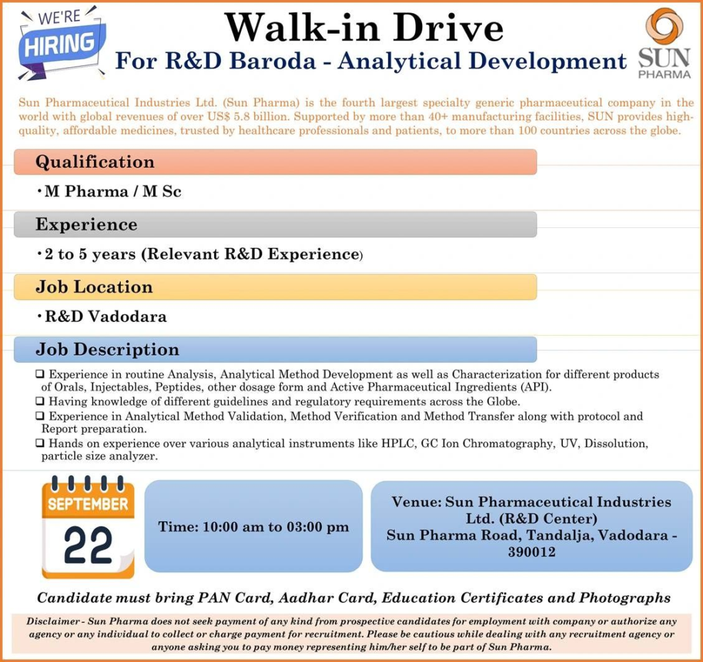 Disclaimer – Sun Pharma does not seek payment of any kind from prospective candidates for employment with company or authorize any agency or any individual to collect or charge payment for recruitment. Please be cautious while dealing with any recruitment agency or anyone asking you to pay money representing him/her self to be part of Sun Pharma.