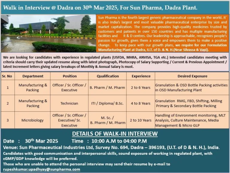 - Interview Venue: Sun Pharmaceutical Industries Ltd, Survey No. 694, Dadra – 396193, (U.T. of D & N. H.), India.