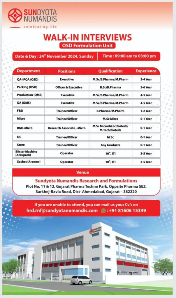 - Venue: Sundyota Numandis, Gujarat Pharma Techno Park, Opp. Pharma SEZ, Dist. Ahmedabad, Gujarat