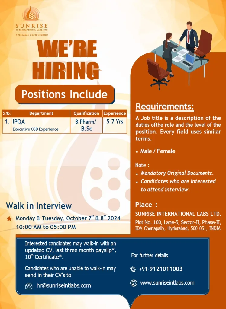 Interested candidates may walk-in with an updated CV, last three month payslip*, Original Degree*, 10th Certificate*. Candidates who are unable to walk-in may send in their CV’s to hr@sunriseintlabs.com