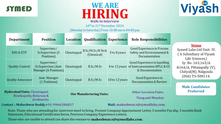 SYMED LABS LIMITED, Leading Bulk drug manufacturer, Recognized by USFDA, WHO, EU GMP and ISO 9001-2015 Plants located at Jeedimetla, Bonthapally & Choutuppal looking for the suitable candidates. Invites Experienced, Dynamic & Self-Motivated Professionals for the below positions.