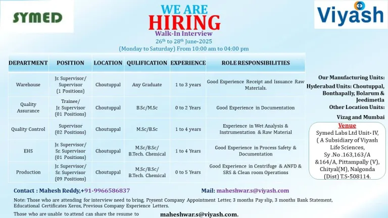 SYMED LABS LIMITED, Leading Bulk drug manufacturer, Recognized by USFDA, WHO, EU GMP and ISO 9001-2015 Plants located at Jeedimetla, Bonthapally & Choutuppal looking for the suitable candidates. Invites Experienced, Dynamic & Self-Motivated Professionals for the below positions.
