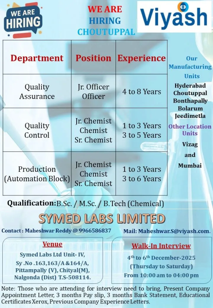 SYMED LABS LIMITED, Leading Bulk drug manufacturer, Recognized by USFDA, WHO, EU GMP and ISO 9001-2015 Plants located at Jeedimetla, Bonthapally & Choutuppal looking for the suitable candidates. Invites Experienced, Dynamic & Self-Motivated Professionals for the below positions.